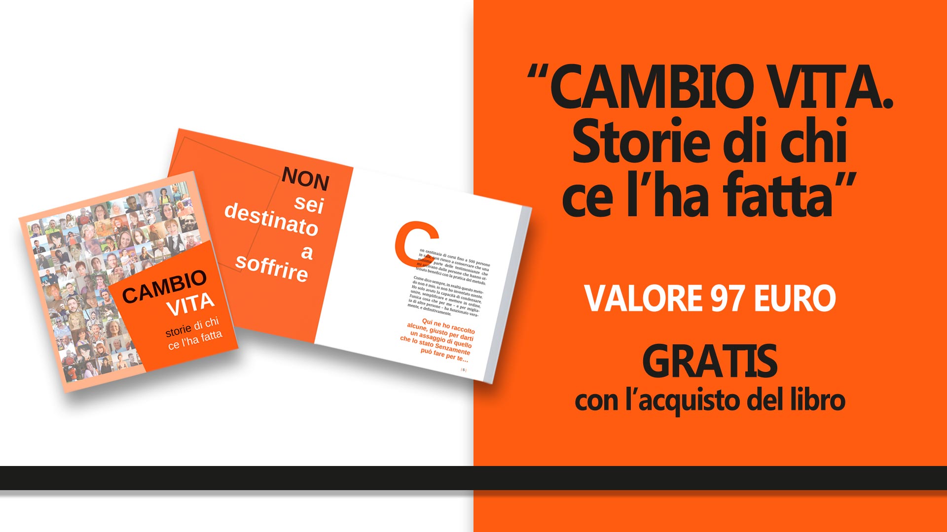 “Cambio vita. Storie di chi ce l’ha fatta” – Un raccoglitore completo in formato digitale con tutte le storie più eclatanti dei miei studenti. Persone che hanno completamente cambiato la loro vita, eliminando la sofferenza, da cui puoi trarre insegnamenti e spunti per migliorare la tua (Valore 97 euro – Gratis con l’acquisto di “Non penso dunque sono”);