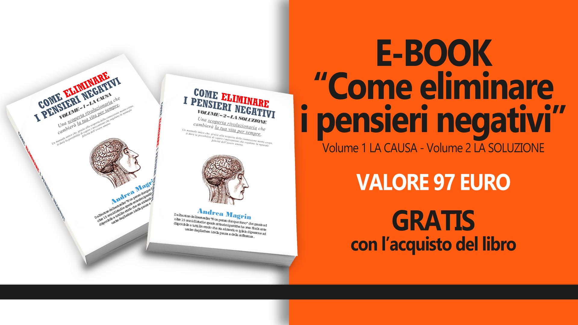 E-book “Come eliminare i pensieri negativi” - Un manuale unico di 124 pagine che, grazie alla scoperta della connessione mente-corpo, ti darà la possibilità di capire i meccanismi che regolano la naturale felicità dell’essere umano (Valore 97 euro – Gratis con l’acquisto di “Non penso dunque sono”);